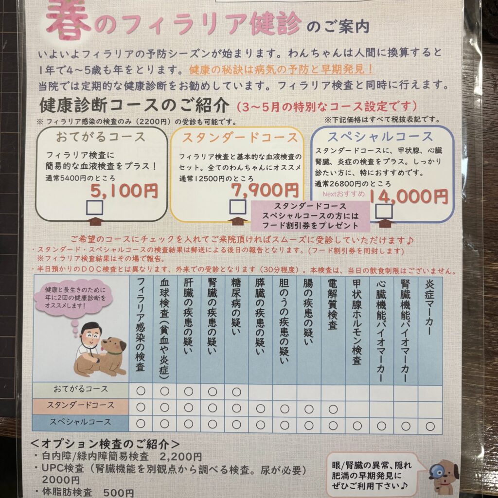 この日のフィラリア検査と同時に受ける健康診断は「スタンダードコース」